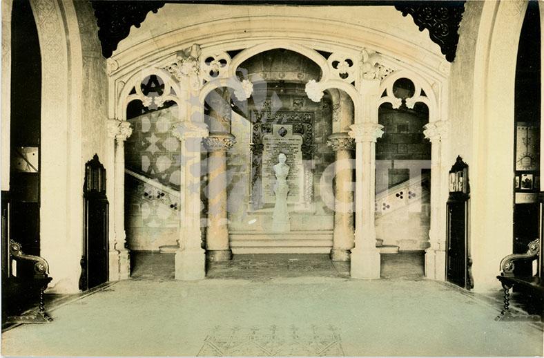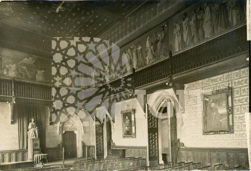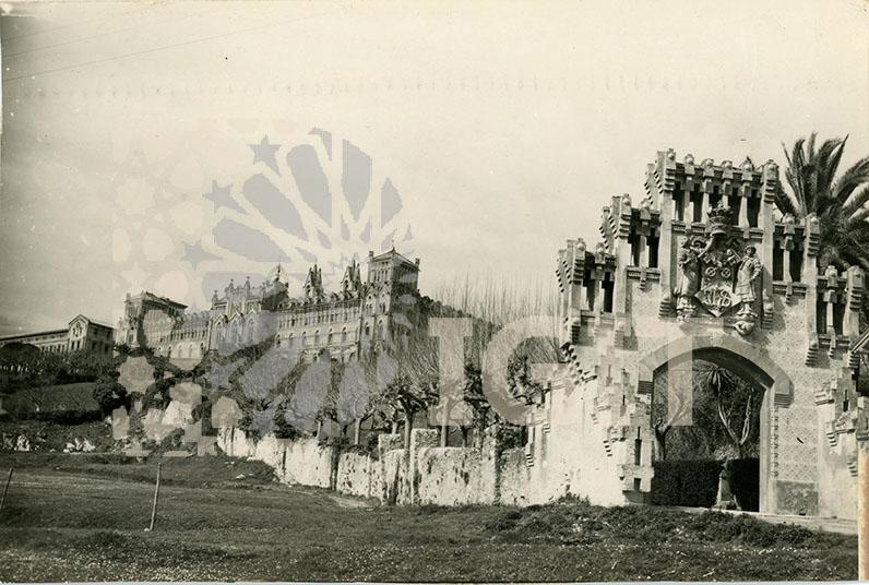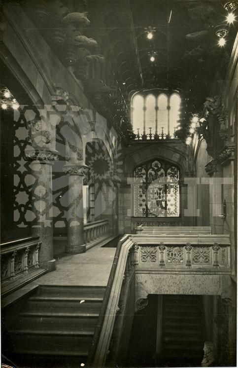 Fotografía del interior del vestíbulo del Seminario Mayor de Comillas diseñado por el arquitecto Luís Domènech y Montaner. Al fondo, se observa la subida a la escalera de doble tiro en cuya meseta, se hallaba el busto en mármol del primer marqués de Comillas, labrado por Francisco Font y hoy ubicado a la Universidad de Comillas de Madrid.