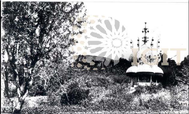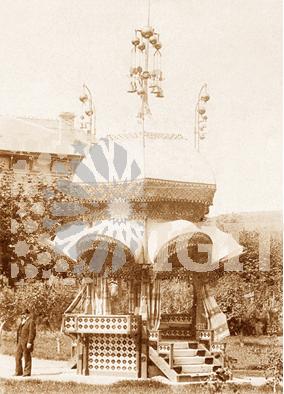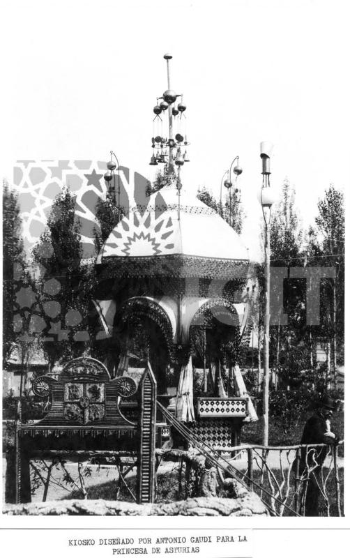 Fotografía de uno de los quioscos diseñados por Antonio Gaudí para los jardines de la casa Ocejo. Construido en madera, metal, azulejos y tela, disponía de una serie de campanas que al ser mecidas por el viento producían notan musicales, que junto a su estética exótica y orientalizante daba un aspecto irreal a los jardines, sorprendiendo a propios y extraños. El quiosco fue trasladado a los jardines del palacio de Pedralbes de Eusebio Güell, pero acabó desapareciendo.