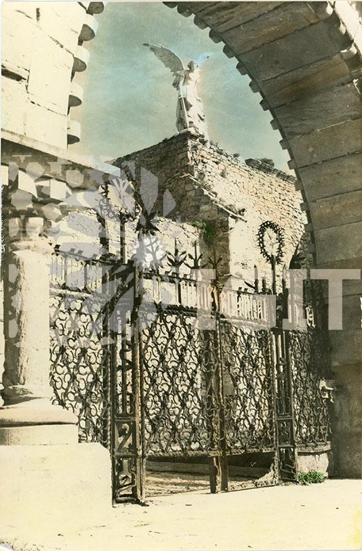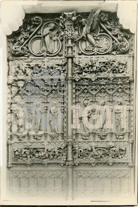 Fotografía en formato tarjeta postal de la Puerta de las Virtudes del Seminario Mayor, obra diseñada por Luis Domènech y Montaner y realizada en bronce en el taller Masriera & Campins de Barcelona. En sus dos hojas, imitando la cubierta de un antiguo libro, se representan las Siete Virtudes, mediante figuras femeninas que portan sus correspondientes atributos y posan sobre peanas bajo las que se representan sus respectivos pecados. La hoja de la derecha muestra, en su esquina inferior, la firma del autor de su diseño "LUIS DOMÉNECH Y MONTANER. ARQUITECTO".