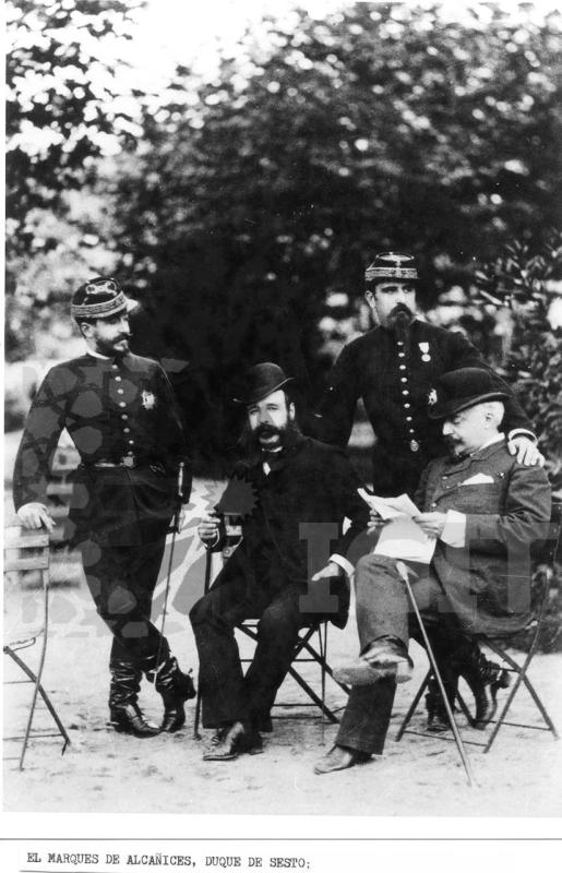 Fotografía del Marqués de Alcañices y Duque de Sesto (el único que mira a cámara), acompañado de otros dos personajes masculinos cuyas identidades se desconocen.