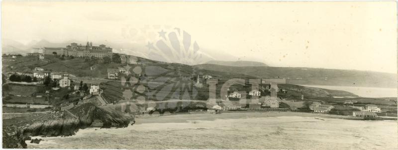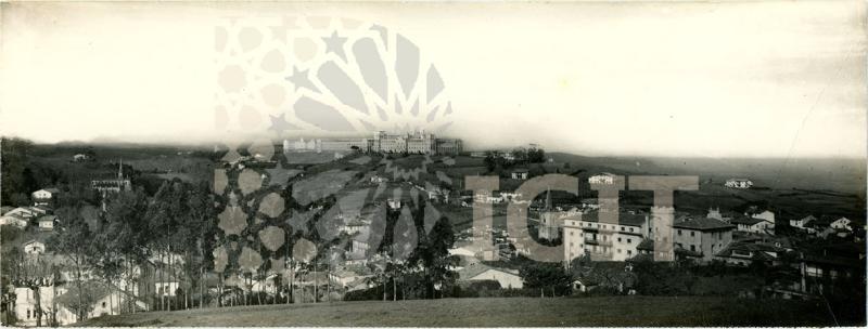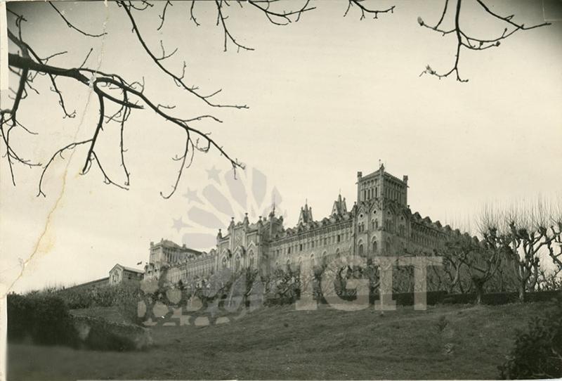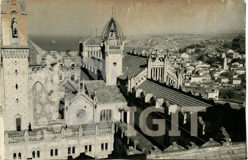 Fotografía en formato tarjeta postal del seminario mayor desde el cercano pabellón Hispano-américano. En el centro destaca la torre del reloj, con su campanario de hierro forjado. Al fondo se observa el pueblo de Comillas, con el hotel Casal del Castro recién inaugurado.