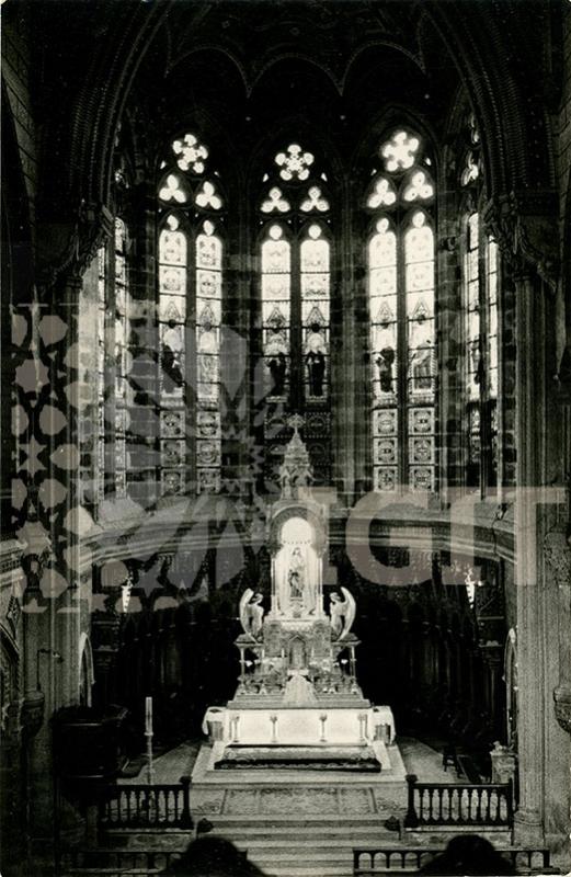 Fotografía editada en formato tarjeta postal de la escalera principal que accede, desde el vestíbulo del Seminario Mayor, al Paraninfo (izqda.) y capilla doméstica (dcha.), obra diseñada por el arquitecto catalán Luis Doménech y Montaner (1889-1892).