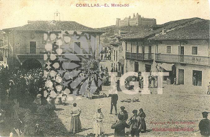 Fotografía en formato tarjeta postal de la Plaza de la Constitución, con la celebración semanal del mercado. Se observa al fondo, el antiguo ayuntamiento de la villa.