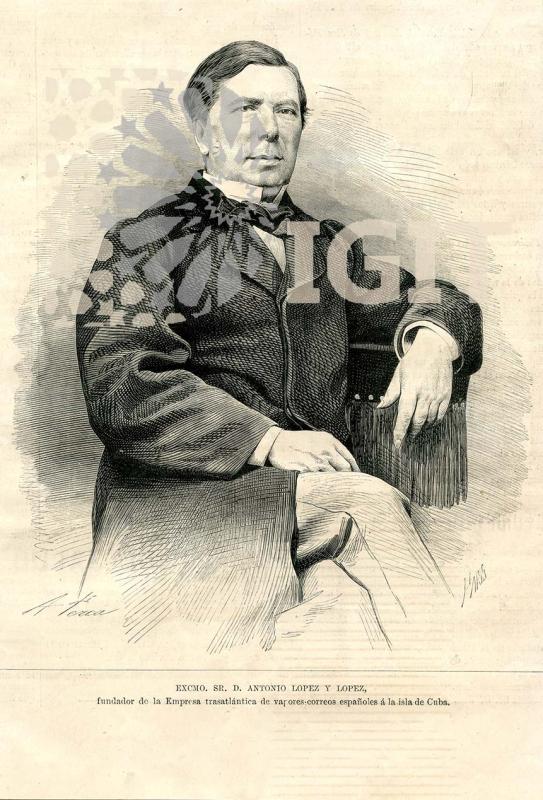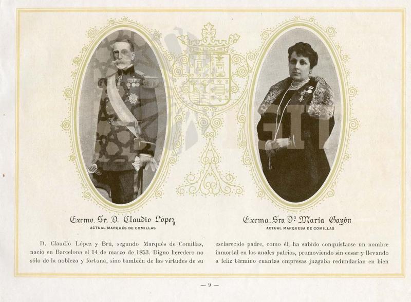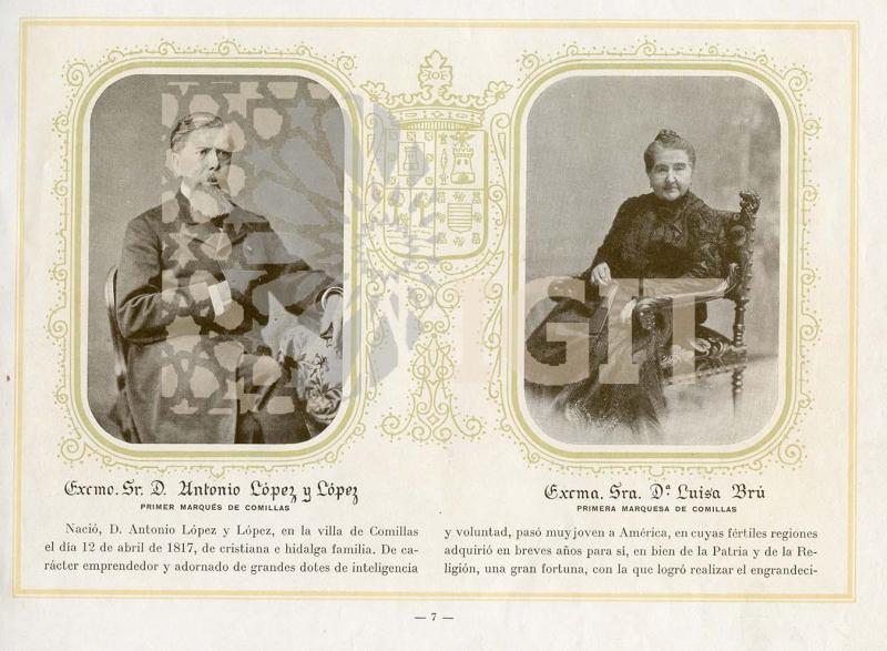 Se trata de una hoja suelta de una publicación de la que desconocemos su naturaleza, en la que aparecen los retratos fotográficos de Antonio López y López, primer marqués de Comillas, y de su esposa, María Luisa Bru.