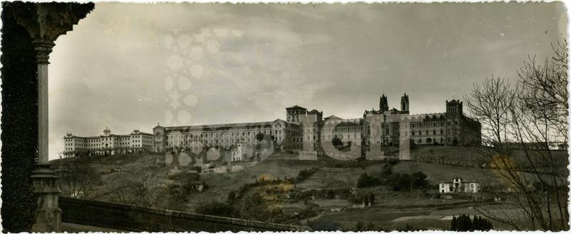 Fotografía en color editada en formato tarjeta postal. Se observa el Seminario Mayor (antigua Universidad Pontificia), el Seminario Menor y el Colegio Máximo, los tres edificados en la colina de La Cardosa.