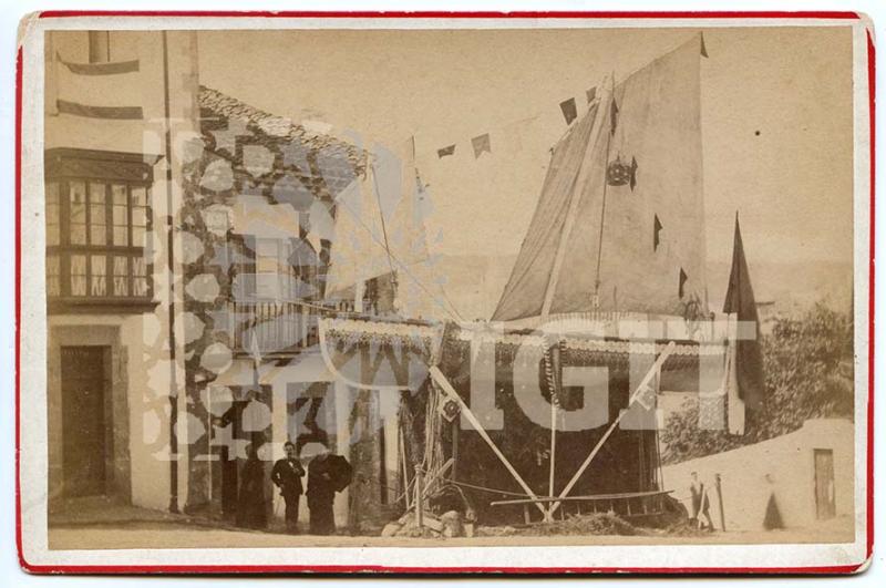 Fotografía de una barca decorada e instalada al final de la Cuesta de Tino. Se trata de un monumento conmemorativo diseñado por Cristóbal Cascante, en este caso en representación de los pescadores.
