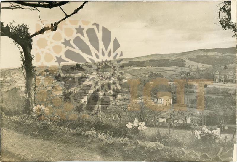 Fotografía editada en formato tarjeta postal en la que se ve una vista panorámica del entorno del Seminario Mayor, especialmente la portalada que da acceso al recinto del inmueble y la corralada que, partiendo de esta, delimita el camino de subida a la colina de La Cardosa.