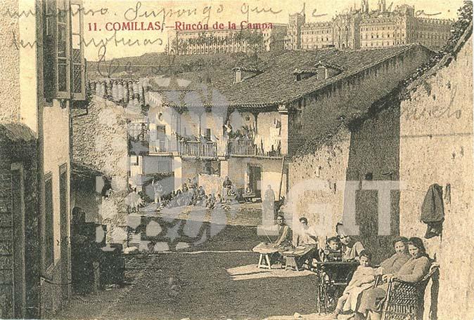 Fotografía editada en formato tarjeta postal de la zona conocida como la Campa, en el barrio de Campíos, destacando las casas dispuestas en hilera y habitantes de Comillas apostados en la calle trabajando en la elaboración de alpargatas de esparto.