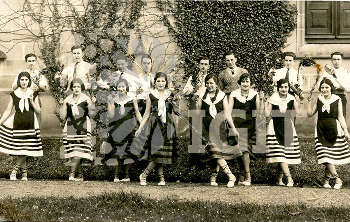 - Fotografía en formato tarjeta postal de La Juventud Artística de Comillas interpretando "La flor de mayo" en los jardines del Palacio de Sobrellano.