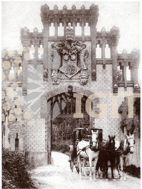 - Fotografía en formato tarjeta postal de la Portalada de acceso a la finca de la antigua Universidad Pontificia, diseño de Luis Doménech y Montaner.