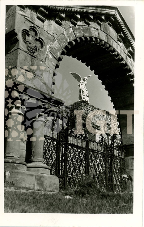 - Fotografía en formato tarjeta postal de la fachada principal del cementerio, enclavado en las ruinas de la antigua iglesia de Comillas y diseñado por Domènech y Montaner.