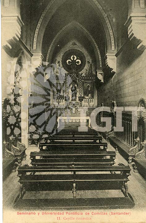 - Fotografía en formato tarjeta postal de la capilla doméstica o de San Ignacio, utilizada únicamente por la comunidad del seminario. Es un pequeño espacio de una sola nave con cubierta a dos aguas con arcos formeros apuntados. En el testero plano un pequeño retablo con la imagen del titular flanqueado por ángeles. Los bancos son diseño de Domènech i Montaner.