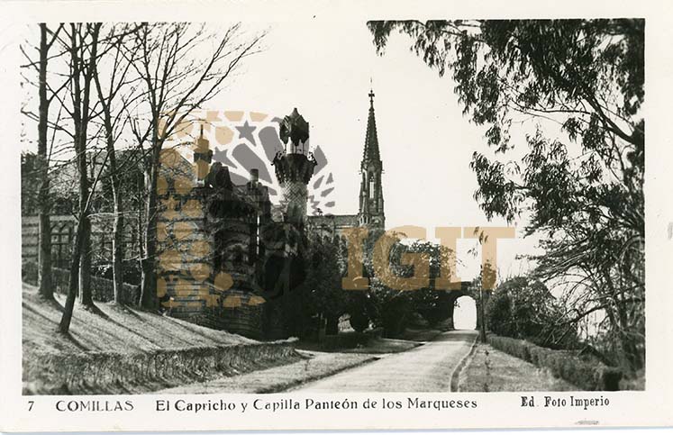 - Fotografía en formato tarjeta postal del Capricho y la Capilla-panteón de los Marqueses de Comillas. Se observa el edificio de Gaudí con el tejado de fibrocemento fruto de la reforma de 1914, mientras que entre este y la capilla se yergue un arco neogótico que no corresponde con el proyecto original Martorell / Cascante, pues fue realizado a mediados de los años 30 por el constructor local Tomás Álvarez.