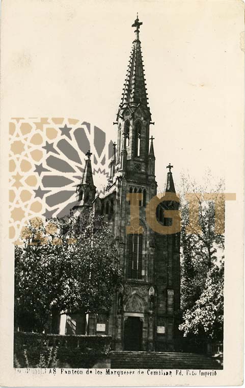 - Fotografía en formato tarjeta postal de la fachada principal de la Capilla-panteón de los Marqueses de Comillas. El edificio fue diseñado en estilo neogótico por Joan Martorell mientras que las obras fueron dirigidas por Camil Oliveras entre 1879 y 1881. Su inauguración fue presidida por los reyes Alfonso XII y María Cristina.