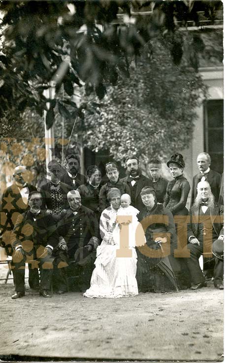 - Fotografía convertida en tarjeta postal en la que aparece la familia real en la Casa Ocejo. La Reina María Cristina en el centro con la Princesa de Asturias en brazos. A la izquierda el ministro de marina, y junto a él Antonio López, primer Marqués de Comillas. Aparecen también las Infantas Paz y Eulalia .