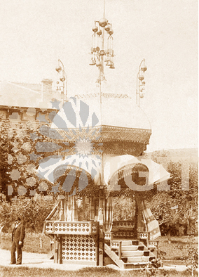- Fotografía de uno de los quioscos diseñados por Antonio Gaudí para los jardines de la casa Ocejo. Más tarde fue trasladado a los jardines del palacio de Pedralbes de Eusebio Güell, pero acabó desapareciendo.