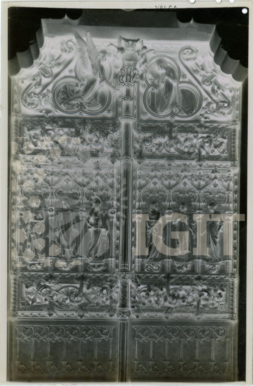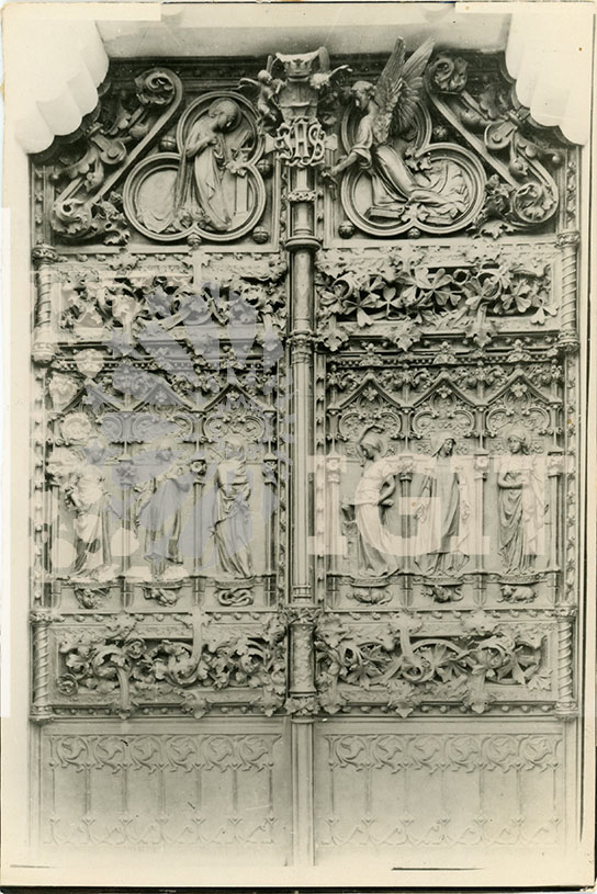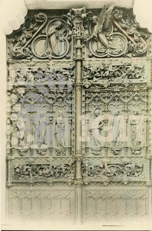 - Fotografía en formato tarjeta postal de la Puerta de las Virtudes del Seminario Mayor, obra diseñada por Luis Domènech y Montaner y realizada en bronce en el taller Masriera & Campins de Barcelona. En sus dos hojas, imitando la cubierta de un antiguo libro, se representan las Siete Virtudes, mediante figuras femeninas que portan sus correspondientes atributos y posan sobre peanas bajo las que se representan sus respectivos pecados. La hoja de la derecha muestra, en su esquina inferior, la firma del autor de su diseño "LUIS DOMÉNECH Y MONTANER. ARQUITECTO".
