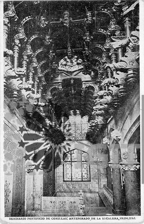 Fotografía en formato tarjeta postal del artesonado diseñado por Lluis Domènech i Montaner, que cubre la escalera principal del seminario mayor. Con forma de quilla invertida, en él se representa un bestiario en alusión al salmo 148.