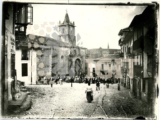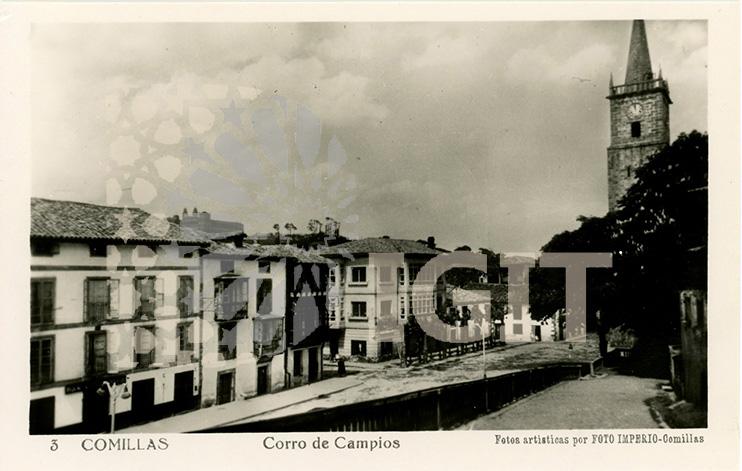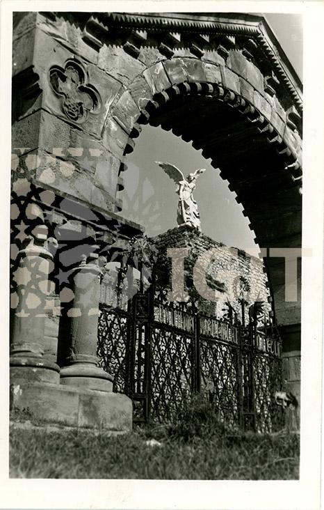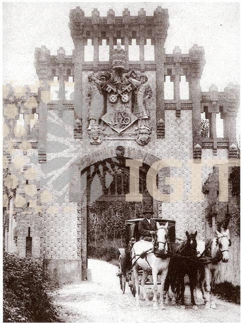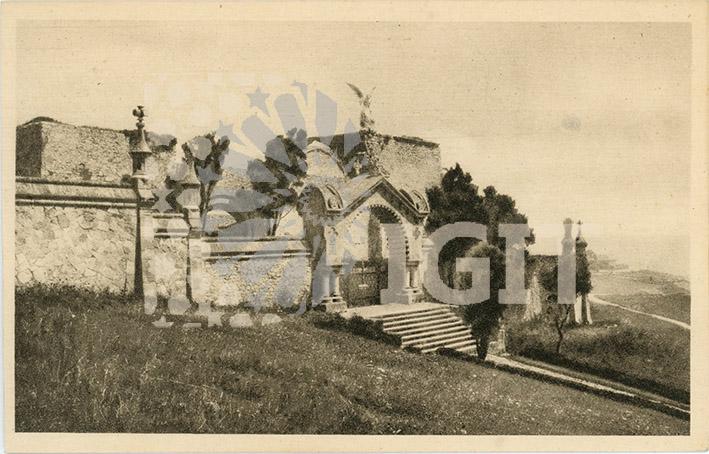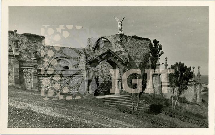 Fotografía en formato tarjeta postal de la fachada principal del cementerio, enclavado en las ruinas de la antigua iglesia de Comillas y diseñado por Domènech y Montaner.