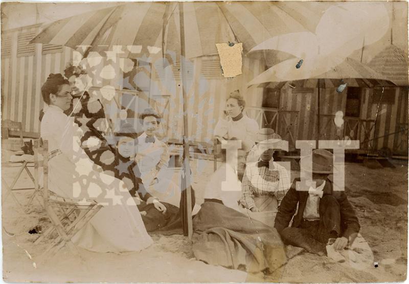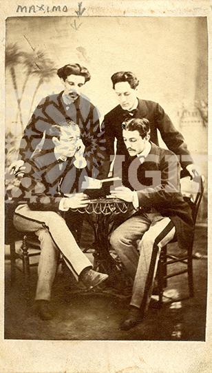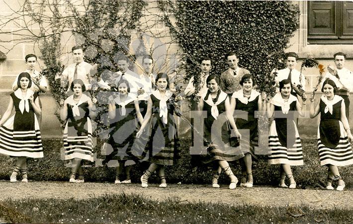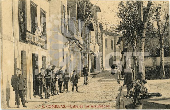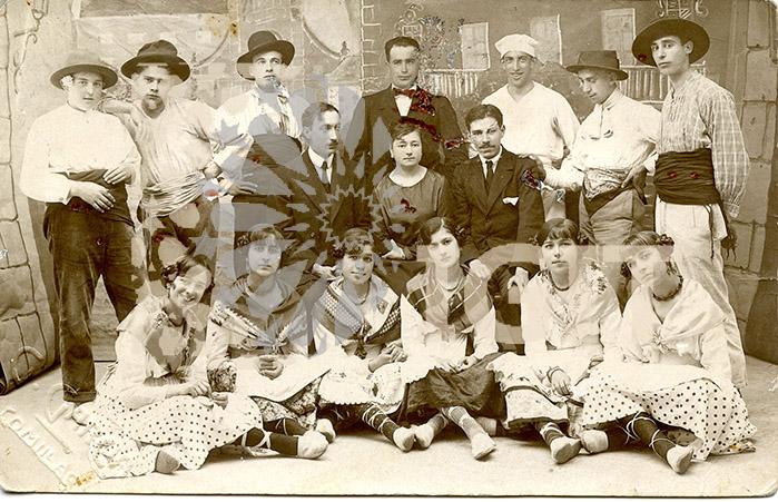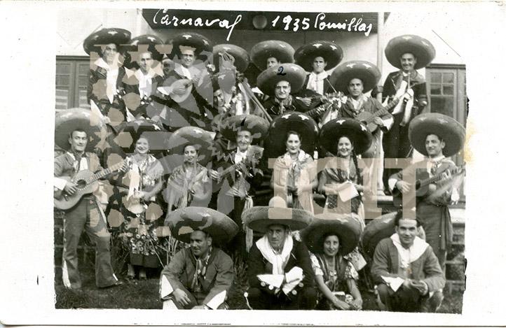 Fotografía en formato tarjeta postal de los Carnavales de 1917, grupo de comillanos disfrazados como "la marcha de Cádiz". Todos los integrantes están identificados en el reverso.