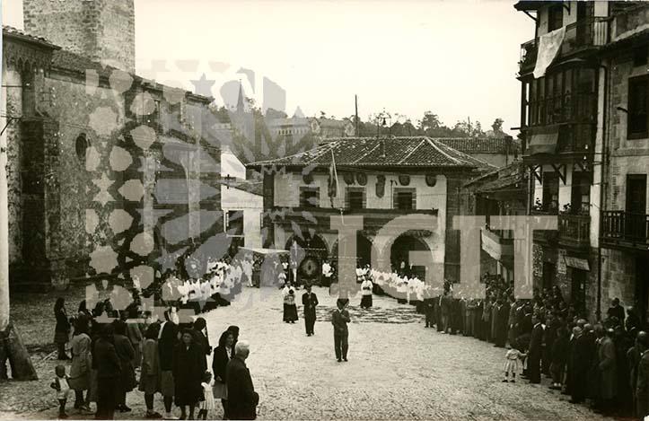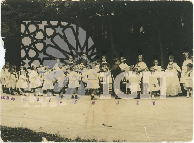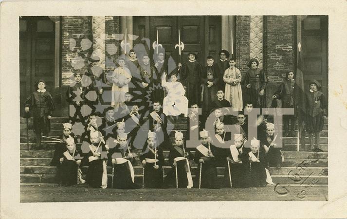 Fotografía en formato tarjeta postal de un grupo infantil ataviado con la indumentaria del Papa, su séquito y la guardia suiza. Posible representación teatral.