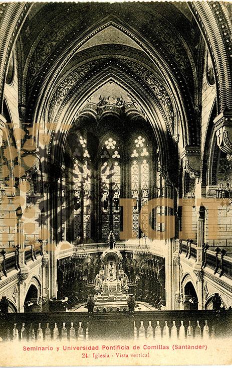 Fotografía que muestra el sillón labrado en piedra que estuvo alojada en el lado izquierdo del presbiterio de la iglesia (capilla pública) del Seminario, junto a la puerta de acceso a la sacristía. Destinado al uso exclusivo y preferencial del marqués de Comillas, hoy en día ha desaparecido y se desconoce su localización.