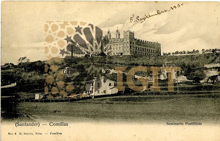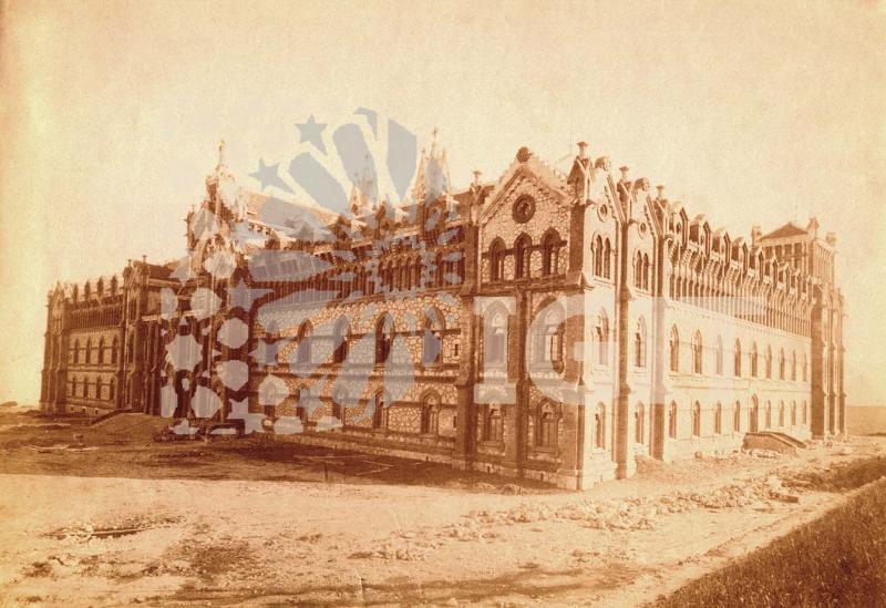 Fotografía en formato tarjeta postal con una vista de las fachadas norte y oeste del Seminario Mayor antes de su inauguración, con el entorno aún sin urbanizar y los andamios sobre el nártex de la iglesia, probablemente se estarían instalando los azulejos diseñados por Doménech y Montaner.